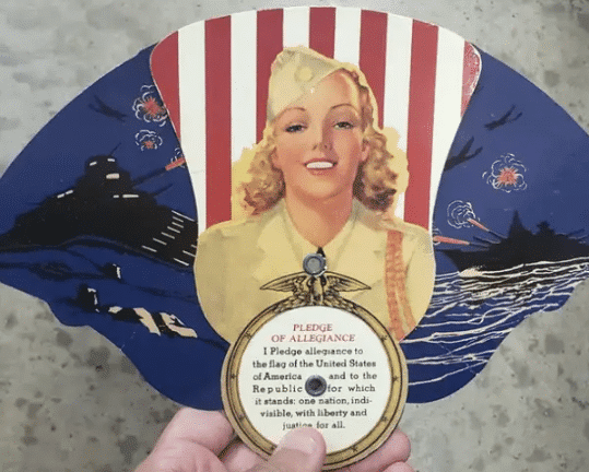 Most of us don’t know the history of the Pledge of Allegiance. This ‘40s-era fan contains an older version of the Pledge that most of us might be surprised to read. Take a look at the verse printed on the fan. Do you notice anything that’s missing? Yup, that’s right, the Pledge of Allegiance didn’t have the phrase “under God” in it during the ‘40s.