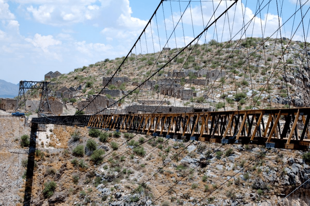 Bathed in golden desert light, the Ojuela Bridge stretches across a canyon like a rusted thread between histories. Once a lifeline to a goldmine, it now serves thrill-seekers who dare to walk its creaky boards. Suspension cables hum with tension in the breeze, and the drop below promises a brutal lesson in gravity.